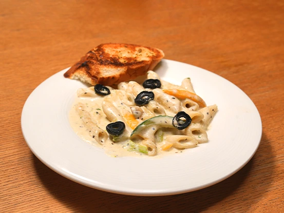 Delight in a plate of our signature creamy pasta, a dish that brings together rich flavors and comforting textures in every bite. Prepared with perfectly cooked penne tossed in a smooth, velvety sauce, it carries a subtle blend of herbs and spices that highlight the authentic essence of Italian cuisine. The freshness of crisp vegetables and the tang of black olives add depth, while the accompanying slice of golden, buttery garlic bread completes the experience with a satisfying crunch. Balanced, wholesome, and crafted with care by our expert chefs, this pasta is more than just a dish—it’s a warm invitation to slow down, savor, and celebrate food at its finest. Whether enjoyed as a personal indulgence or shared at the table, it promises to create memorable dining moments for every guest.